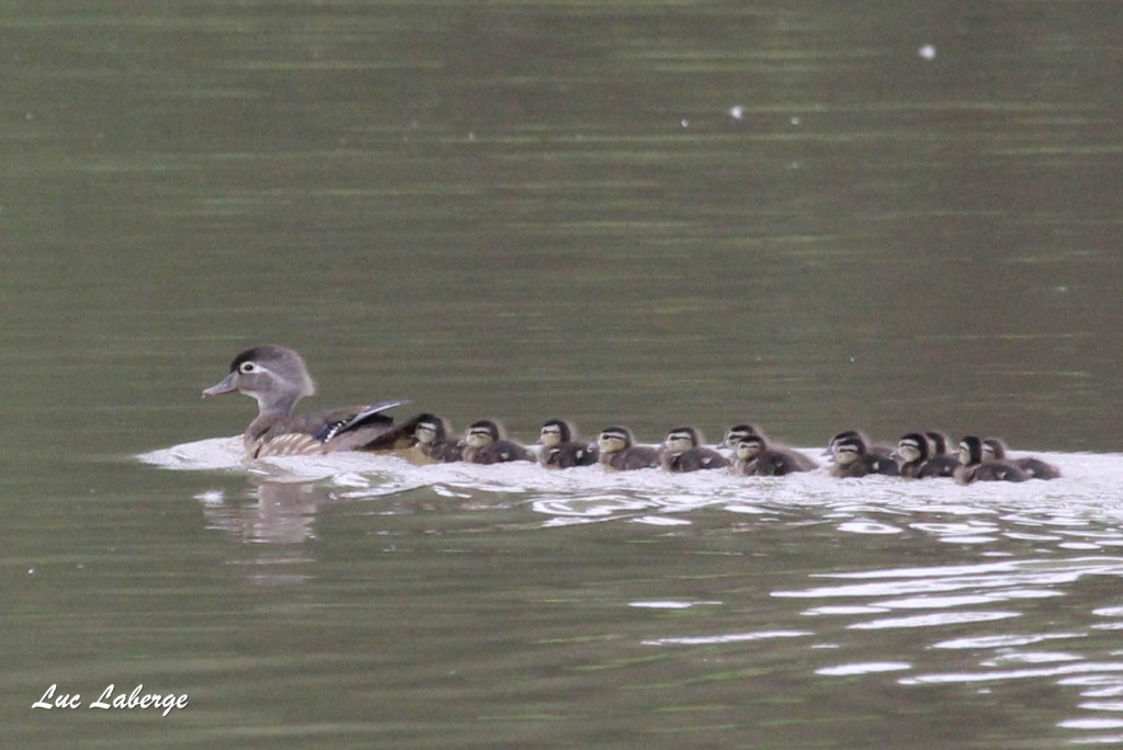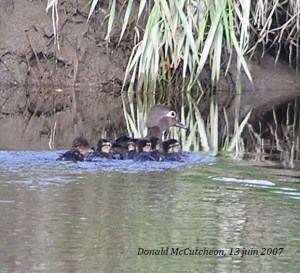 « J’ai lu avec grand intérêt ton blog ayant moi-même été témoins du même phénomène le 13 juin 2007 : femelle branchu avec ses canetons dont un était un Harle couronné. C’était à l’Étang Stater à Irlande, à quelque 15 kilomètres de Thetford Mines. Nous installions une bonne vingtaine de nichoirs de Canards branchus dans ce grand marais. En vérifiant nos nichoirs chaque hiver pour connaître le succès de reproduction des canards, il est arrivé assez souvent que nous retrouvions un mélange d’œufs non éclos de Canard branchu et de Harle couronné. Bien sûr, j’étais fort content de trouver cette portée inusitée et d’avoir eu le temps de prendre cette photo révélatrice.» – Donald McCutcheon