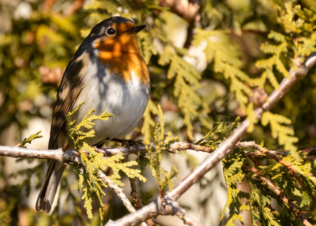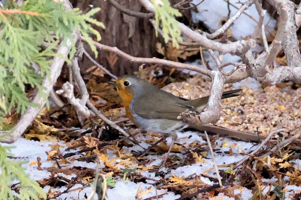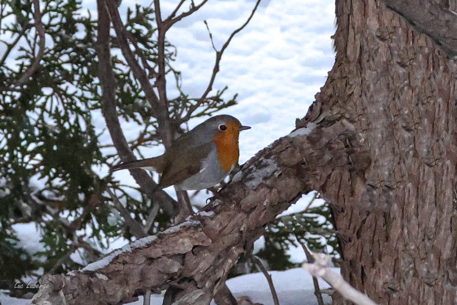 L’oiseau passera-t-il l’hiver? Comme tous les oiseaux, le rougegorge peut gonfler ses plumes pour s’isoler du froid et frisonner pour générer de la chaleur (voir La mésange en hiver). Toutefois, l’espèce n’est pas adaptée aux épisodes de froid soutenu et de verglas que nous connaissons dans la région métropolitaine. Qui plus est le couvert de neige complique et limite la quête de nourriture nécessaire pour répondre à l’augmentation de ses besoins métaboliques. Sans compter le stress qu’il vit en raison de son vedettariat, ses besoins d’hydratation et les attaques potentielles de prédateurs, comme les chats et les éperviers.