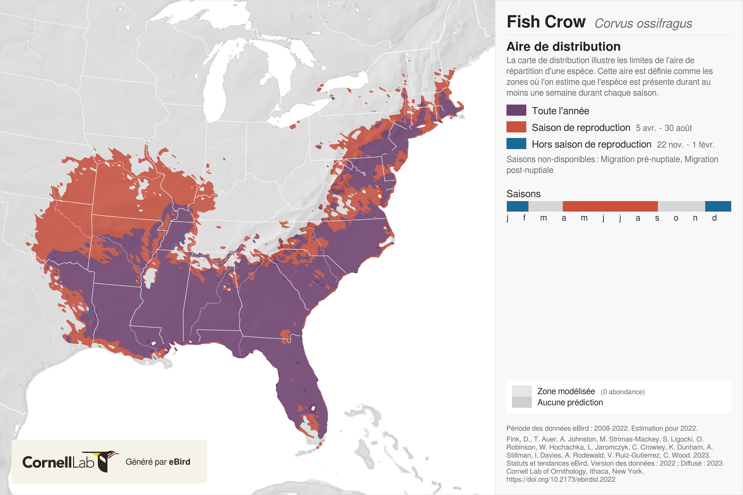 L’aire de répartition de la Corneille de rivage s’étend depuis la Floride tout le long de la côte Atlantique jusqu’en Nouvelle-Écosse ainsi que le long des basses terres du Mississipi et de ses affluents. Cette espèce habite ces endroits à l’année ou n’effectue que de courts déplacements. Il faut noter une extension vers le nord de cette corneille pour la reproduction. Pour la période 2012-2022, les experts d’eBird rapportent une tendance à l’augmentation médiane de l’abondance relative estimée à 12,2%.