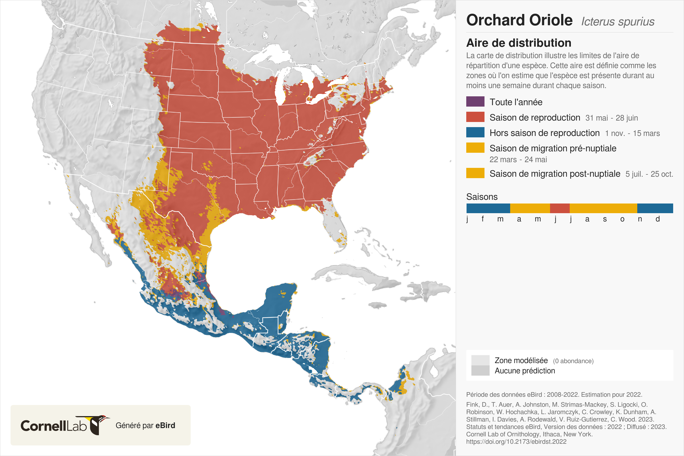 L’aire de reproduction de l’Oriole des vergers couvre un large territoire dont le centre et l’est des États-Unis. Elle s’étend vers le sud, jusqu’au Mexique et vers le nord jusqu’au sud du Canada. Pour la période 2012-2022, les experts eBird rapportent une tendance à l’augmentation de l’abondance relative dans cette aire de 5,6% (valeur médiane). En dehors de la période reproductrice, l’oriole migre vers le sud du Mexique, en Amérique centrale et jusqu’au Pérou.