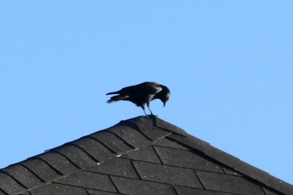 Cliquez ici pour entendre le cri de la Corneille de rivage que Louise Auclair a enregistré. Le photo ci-dessous a été prise alors que les corneilles criaient. Il n’est pas facile de distinguer cette espèce de la Corneille d’Amérique autrement que par le cri.