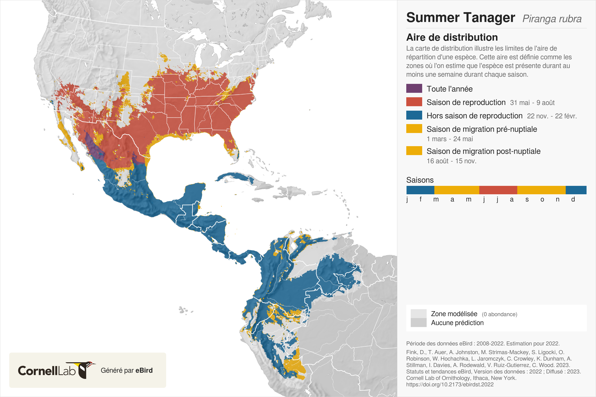 L’aire de reproduction du Piranga vermillon couvre principalement le bassin du Mississipi et la côte Atlantique ainsi que le nord du Mexique. Pour la période 2012-2022, les experts d’eBird estiment une tendance à l’augmentation de l’abondance relative de 22,6% (valeur médian) pour cette aire. Les probabilités d’occurrence au-delà de l’État de New-York demeurent très faibles. En période post-reproduction, ce piranga migre vers le sud, dans une aire s’étendant du Mexique jusqu’au Venezuela et en Colombie.