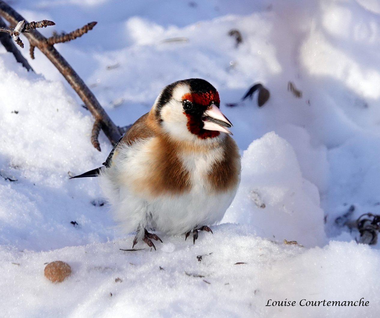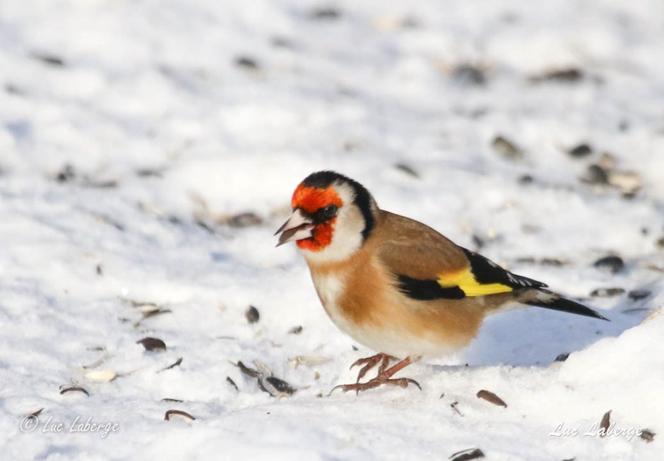 Au Québec, les mentions confirmées de chardonneret élégant sont nombreuses et surviennent sur une base quasi-annuelle depuis 2010 (voir eBird). Entre autres, des observateurs ont mentionné un individu au Jardin botanique de Montréal, du 29 novembre 1996 au 2 décembre 1997, une présence d’une longueur exceptionnelle. Les feuillets que j’ai consultés sur eBird pemettent de constater (1) que jamais plus d’un individu n’a été observé à la fois, (2) qu’un chardonneret élégant peut passer l’hiver dans nos régions, (3) qu’une très grande majorité des observations rapportent qu’il s’alimente aux mangeoires, et (4) qu’il est généralement observé en compagnie de chardonnerets jaunes.