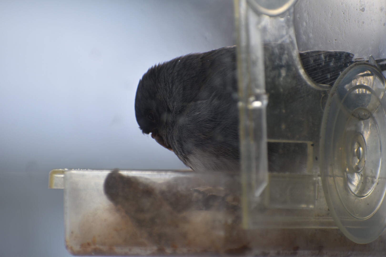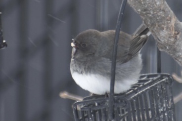 23 janvier 2021 à Marieville (Montérégie) Lory-Antoine Cantin a photographié ce Junco ardoisé à ses mangeoires. « Il s’alimentait quand même bien », nous dit Lory.